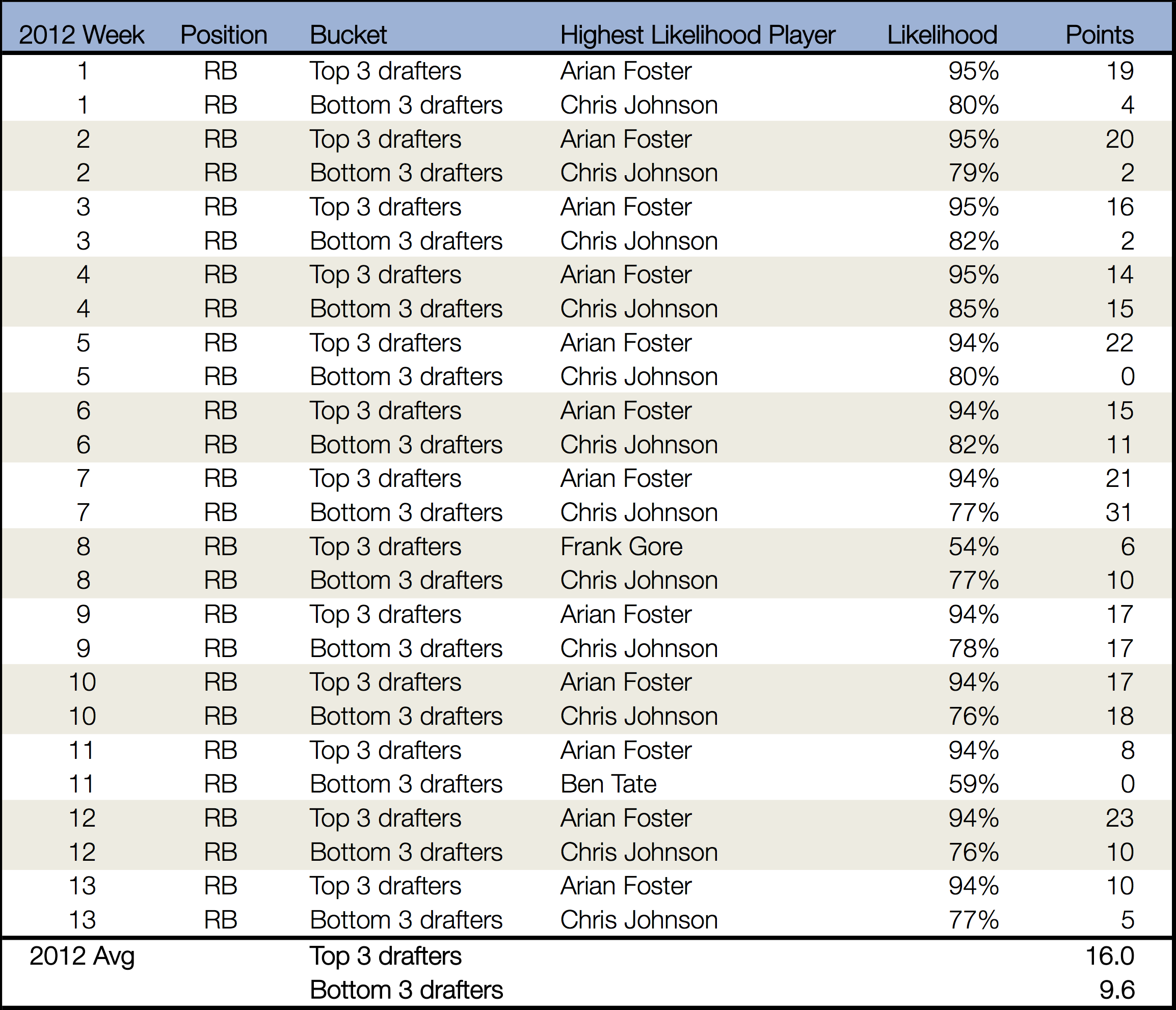 For instance, here are the players at the RB position, week-by-week, with the single highest Top 3 Likelihood Score and the single highest Bottom 3 Likelihood Score: