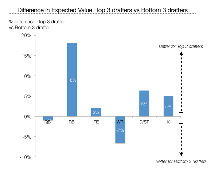 This gives us, conceptually, an “expected value” of a player at each position for a Top 3 drafter vs a Bottom 3 drafter. By comparing the differences in expected value, we can see where the advantages to early drafters are the largest.