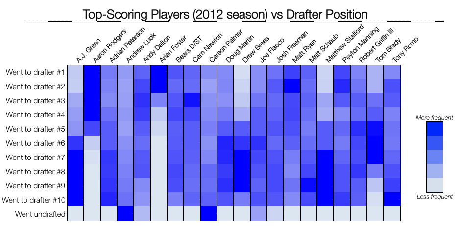 Looking at the data below, it seems that draft order doesn’t really have much of an impact on who gets those superstars. Below are the top-scoring players for the season (remember, this was the 2012 season), and the percentage of time that they went to the player that drafted 1st vs the player that drafted 2nd, etc. The bolder the blue, the more often the player went to someone in that position.
