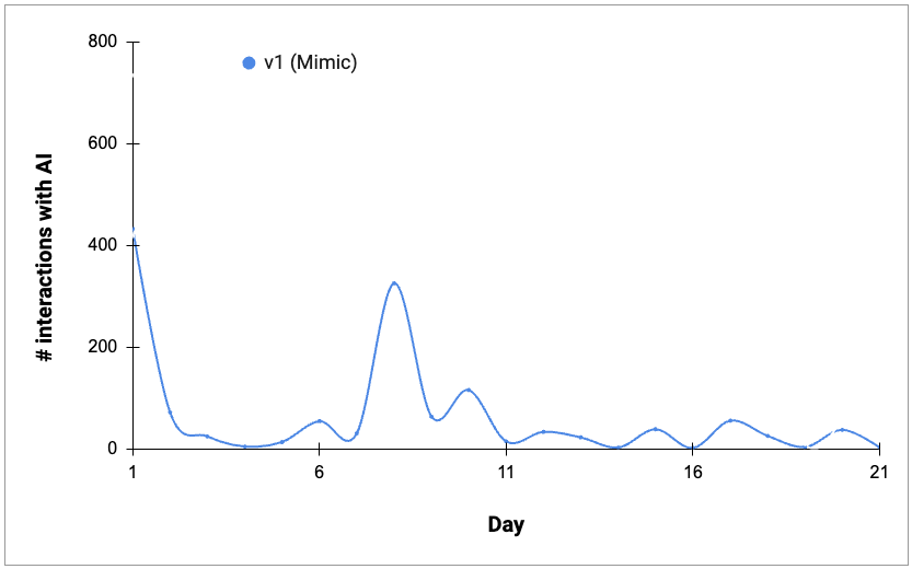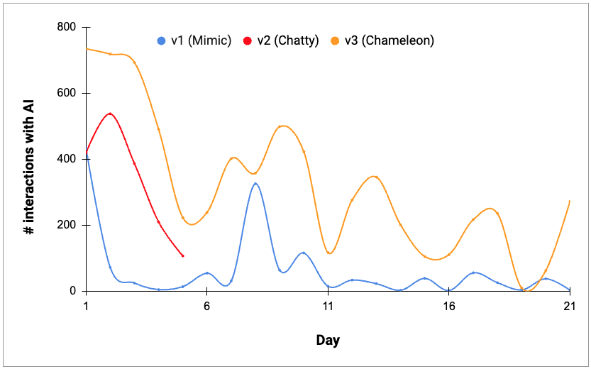 Engagement with v1 (“Mimic D4ve”) was initially high, but that didn’t translate to sustained engagement. Adding a mimic for a second person after a week had a similar outcome.(“Day” is number of days since deploying that version into the chat, “# interactions with AI” is the number of messages the group had to or from the AI that day.)
