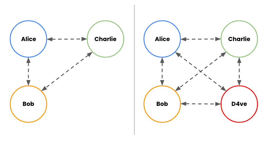 Adding “D4ve” to the group chat of Alice, Bob, and Charlie
