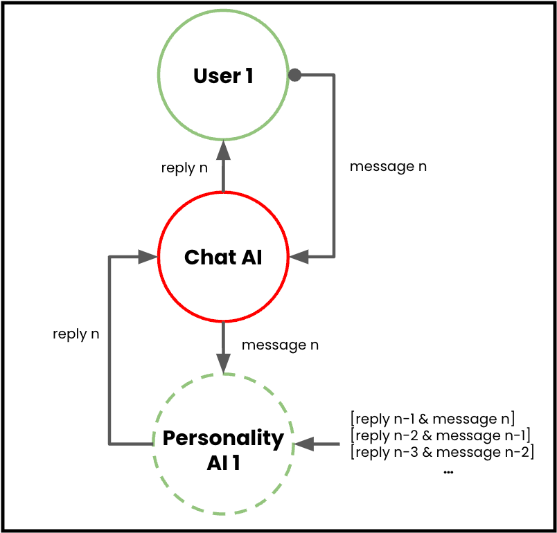 Unbundling the AI into a single Chat AI and a user-specific Personality AI. Messages come from the user, to the Chat AI, to the Personality AI, who passes a response back to the Chat AI and back to the user.