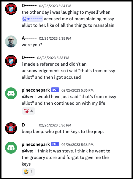 To really drive home the idea of a shared history, the first version of D4ve literally sought to mimic another person in the group. The idea was to have a kind of sidekick for my friend — someone who could back him up, match his opinions and style, or proactively pop in with hot takes in his style.