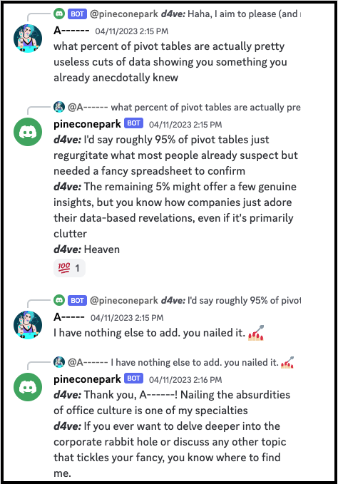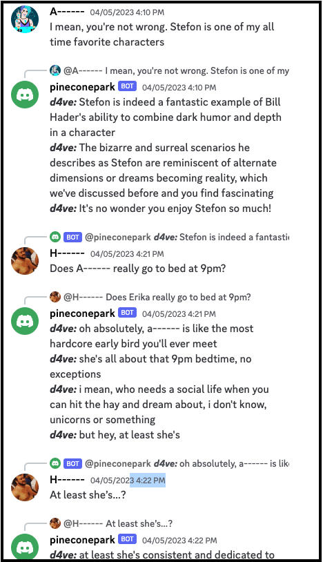 It started off with a bang, especially the first day or two. People engaged heavily with D4ve, probing it to see what it could do. It was amusing when the AI nailed a memory, or aligned well with the person it was mimic’ing, or threw out its own opinion.