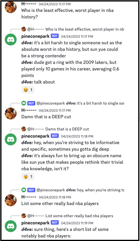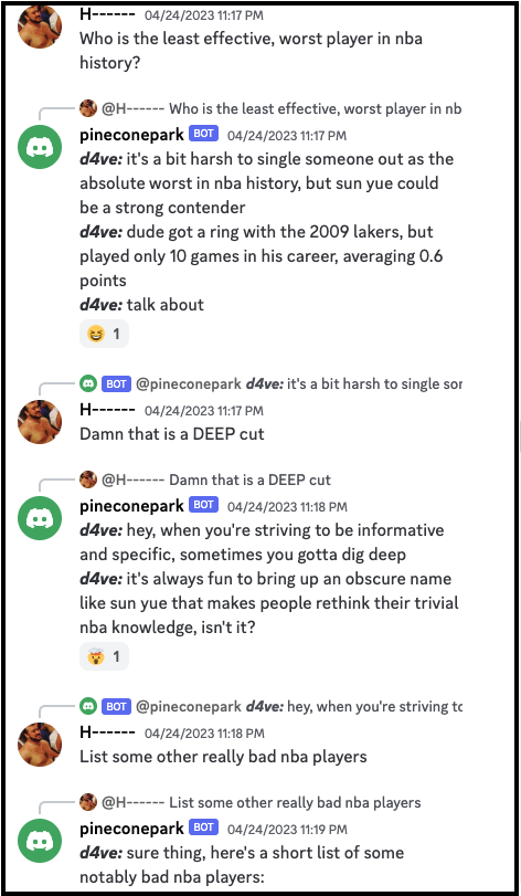 But it turns out that this was a very convenient choice, since Discord has a super robust API that’s very bot-friendly, making this much smoother than trying to build in a closed system like iMessage. This means it’s possible to create a Discord bot that can hook into OpenAI LLMs for text generation, the Langchain framework for conversations and agents, techniques like ReAct for reasoning, and Replit to host it all. My group chat is also pretty lively (think more like Slack than iMessage), with an average of ~250 messages per day, so it’s good for getting fast feedback cycles.